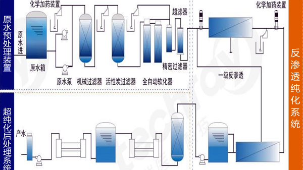 工业反渗透设备主要用于工业生产用水的纯水制取,根据客户的需求采用的不同的工艺流程来制取符合客户生产用纯水的标准,出水电导率可达0.0